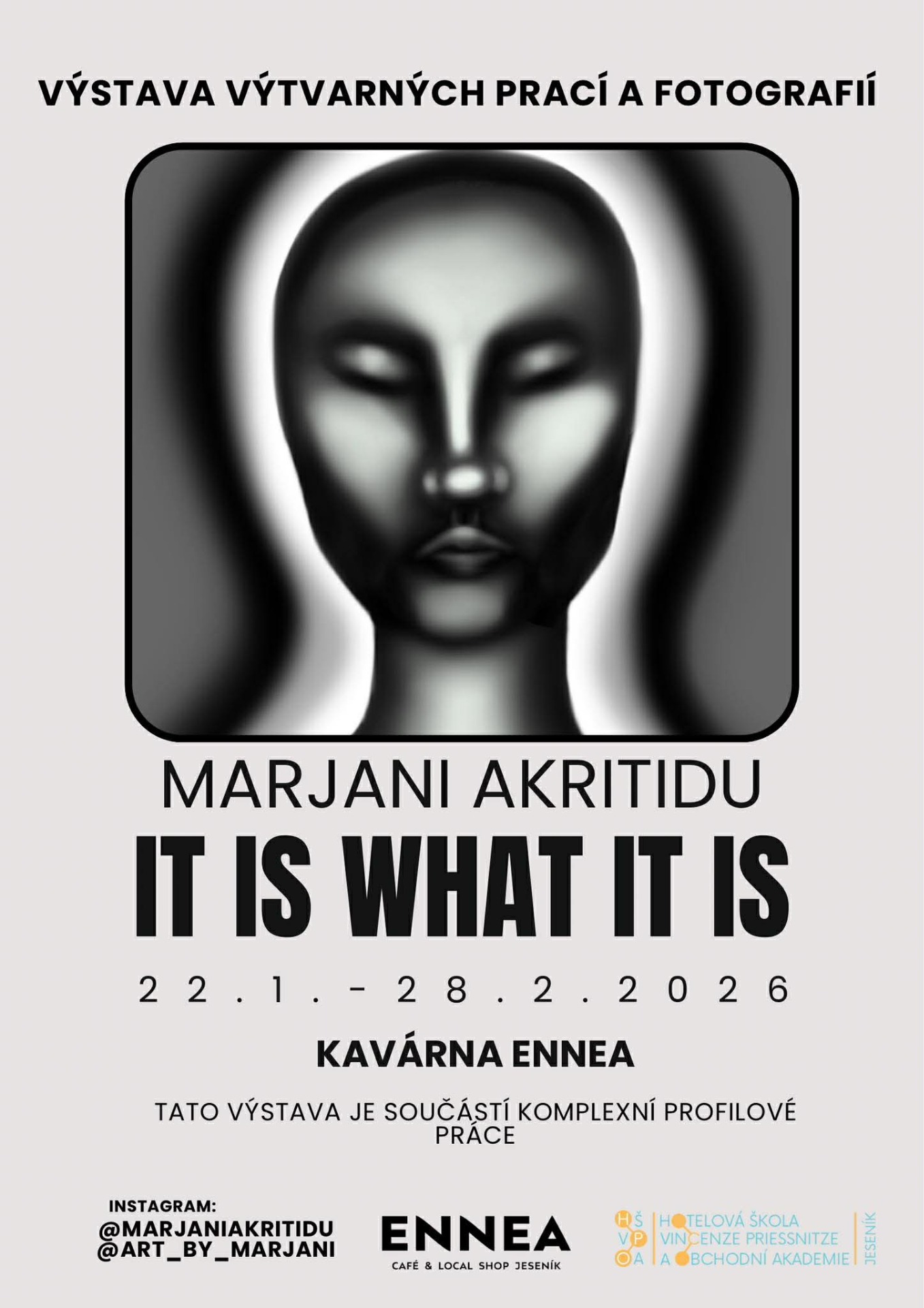 Chtěla bych Vás pozvat na svou výstavu s názvem IT IS WHAT IT IS, která do 15. března probíhá v kavárně ENNEA na náměstí Svobody. Výstava představuje průřez mou dosavadní tvorbou. Najdete tu fotografie, linoryty, suchou jehlu, malby na plátno, kresbu tužkou a drobné črty. Co je na téhle výstavě zajímavé a proč tohle celé vlastně píšu je, že je to výstava, která je součástí komplexní absolventské práce na Hotelové škole v Jeseníku. A o co vlastně jde?